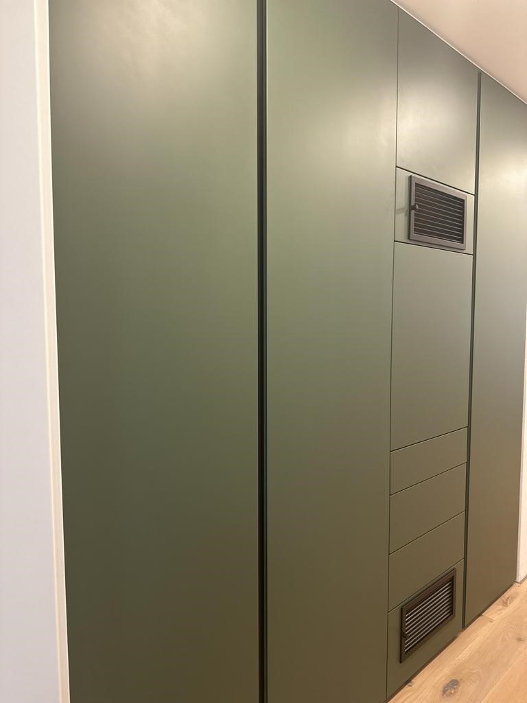 Im Wohnflur haben wir einen Einbauschrank im Farbton „Lodengrün“ mit Auslass für den vorhandnen Kachelofen angefertigt.